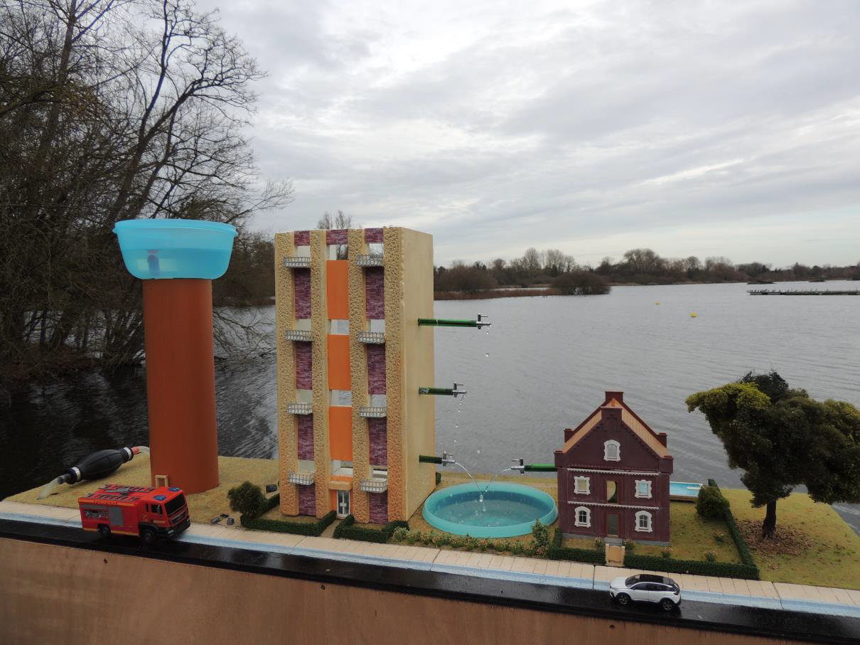 Cette maquette retrace le parcours de l’eau, depuis la station de pompage dans la nappe phréatique de la craie jusqu’aux rejets dans le cours d’eau en passant par le château d’eau, les habitations et l’épuration.